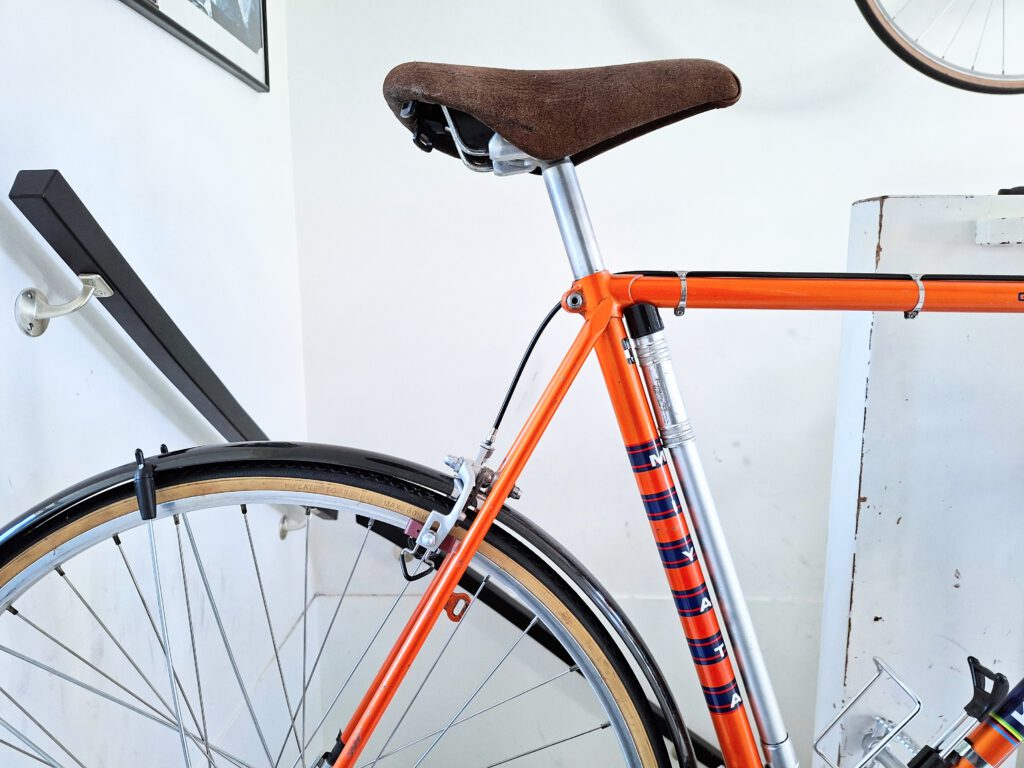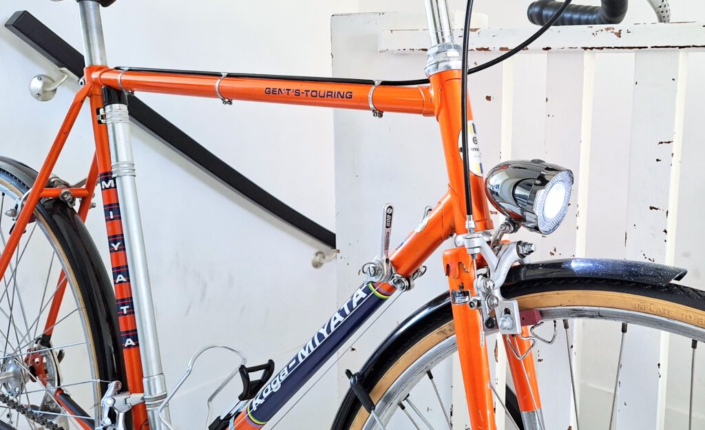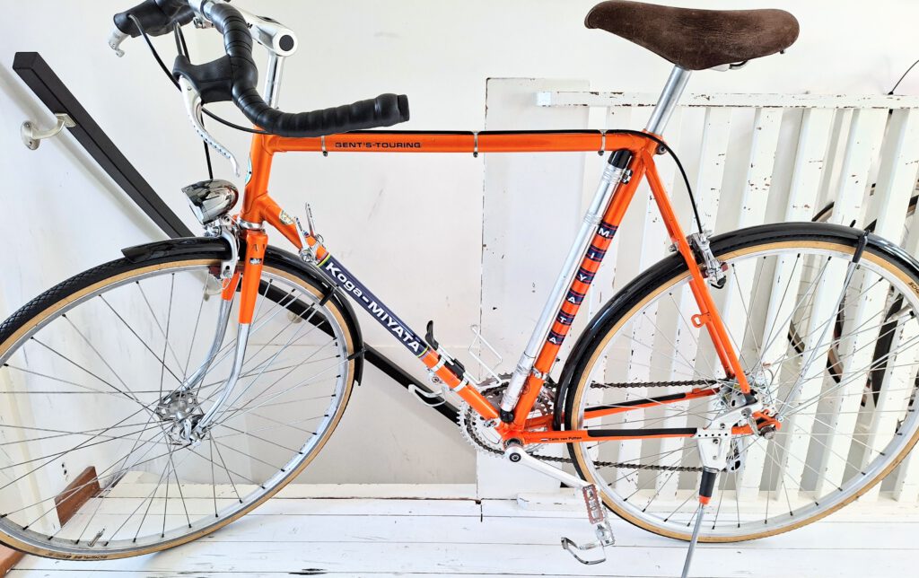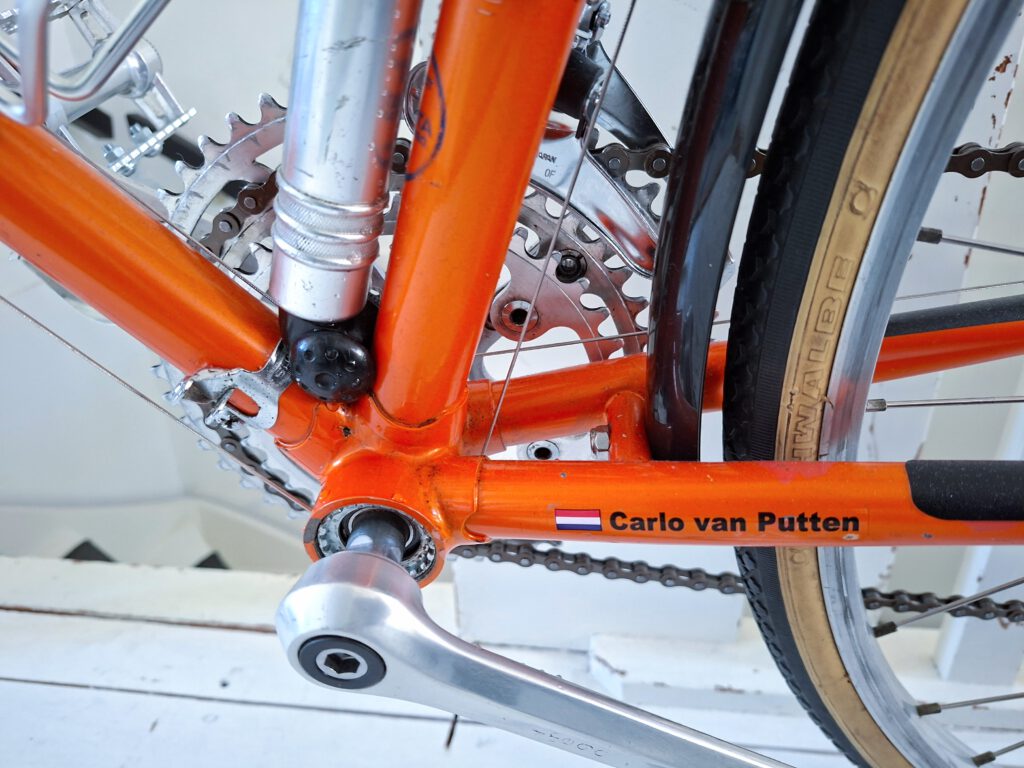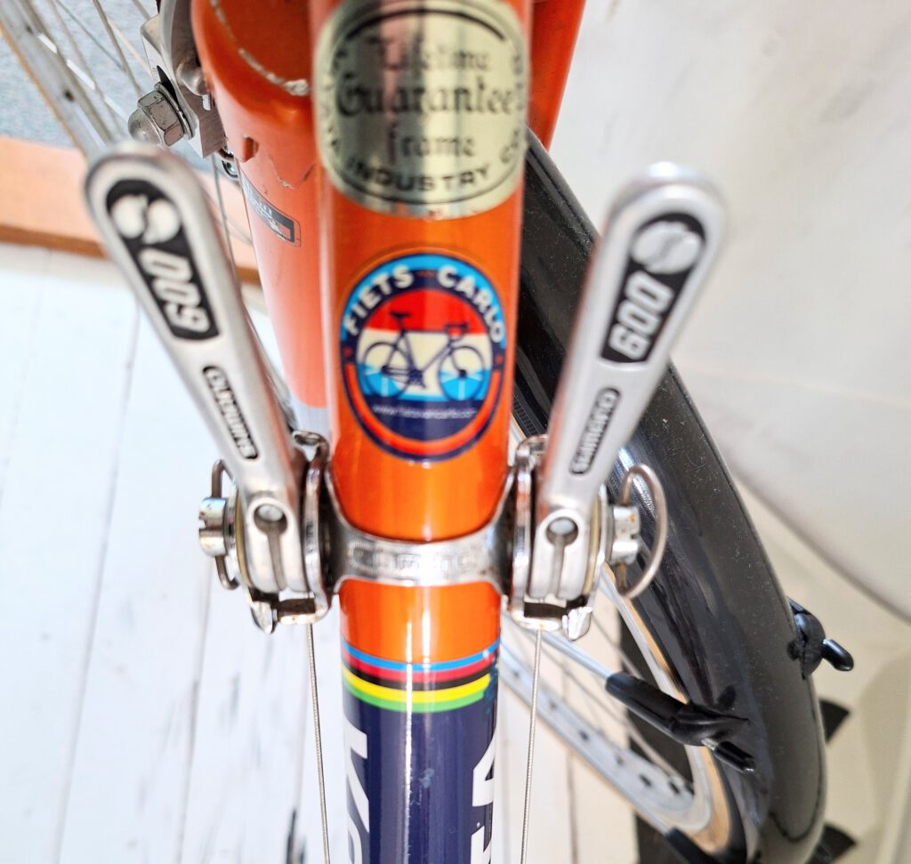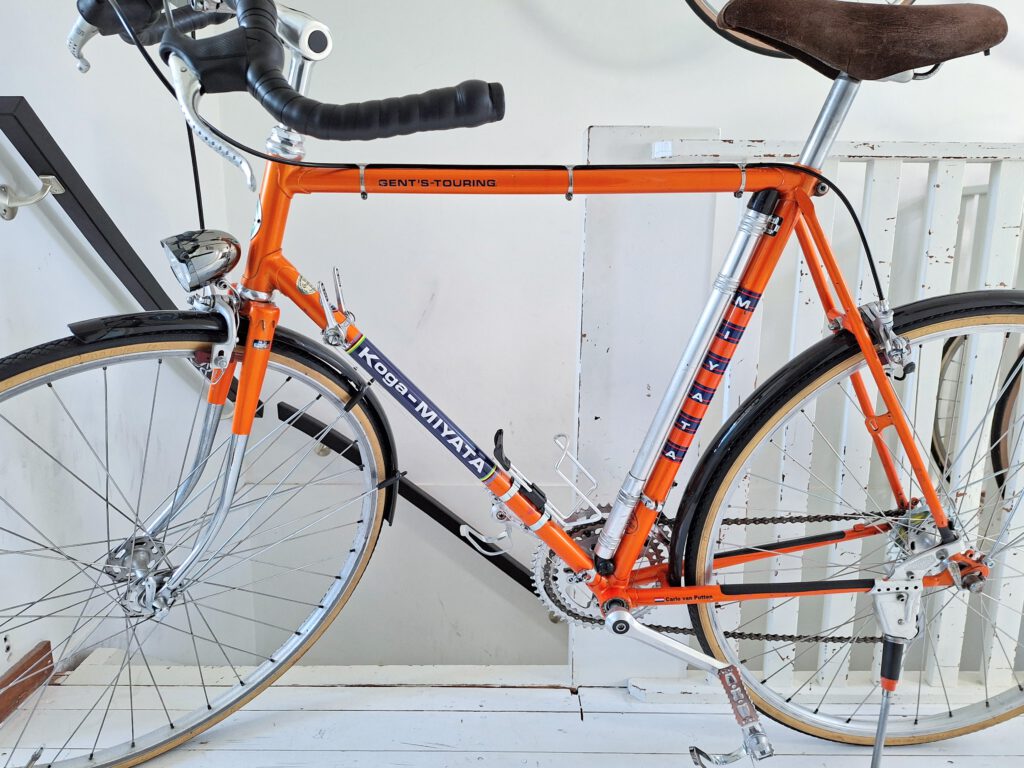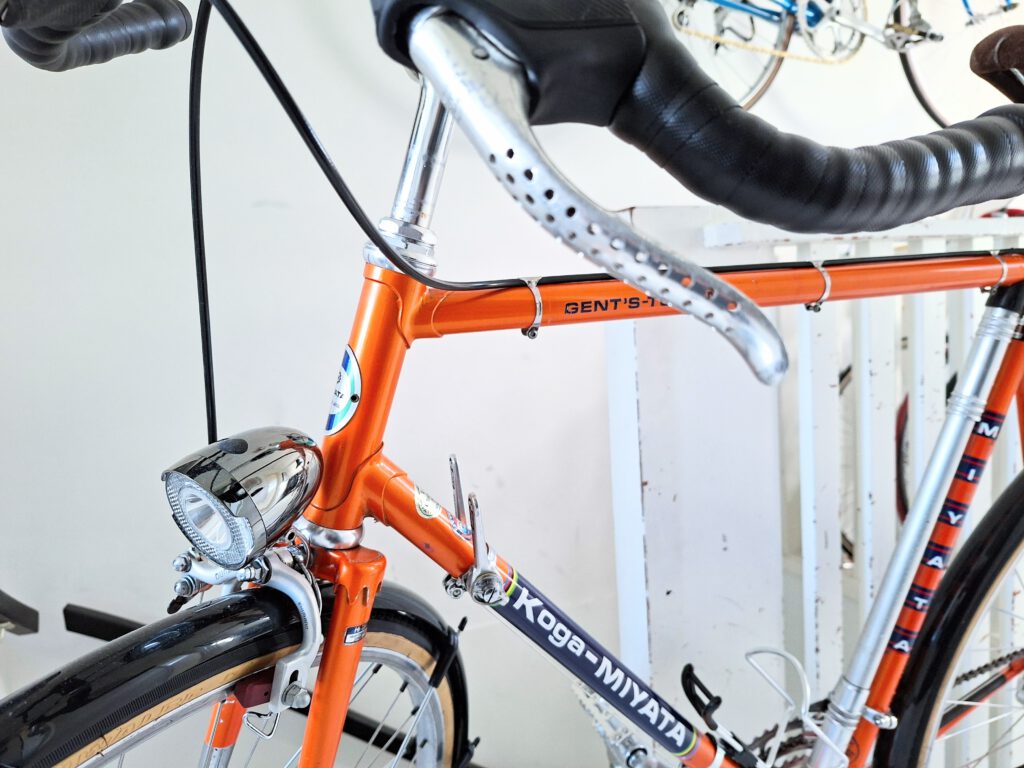 Staat: De fiets verkeert in prachtige staat. Het betreft een standaard Koga Miyata uit het eerste productiejaar. Uiteraard zijn er gebruikssporen aanwezig die passen bij de leeftijd (zie foto’s) tegenwoordig noemen we dat ‘patina’. Desondanks is de fiets volledig gerestaureerd, met oog voor zowel modern comfort als het behoud van zijn klassieke uitstraling. De fiets is voorzien van hoogwaardige Shimano Dura-Ace remhoeven, evenals stijlvolle, vintage spatborden en batterijverlichting — ideaal voor ontspannen citytochten. Daarnaast beschikt hij over een nieuwe trapas met een triple crankset van Ofmega en Deore DX derailleurs, waardoor ook steilere wegen moeiteloos te beklimmen zijn. Alle slijtageonderdelen zijn vakkundig en zorgvuldig vervangen. Zo zijn onder andere de Schwalbe buitenbanden, binnenbanden, rem- en schakelkabels, cassette, tandwielen, stuurlint, ketting en remblokken vernieuwd. De fiets is uitgerust met een zogenoemd city racer-stuur, dat zorgt voor extra controle en comfort op de weg. Desgewenst kan dit uiteraard worden vervangen door een klassiek racestuur.