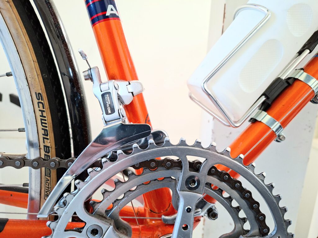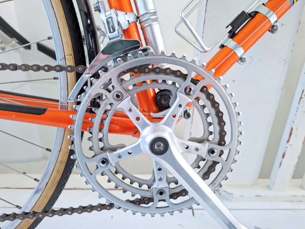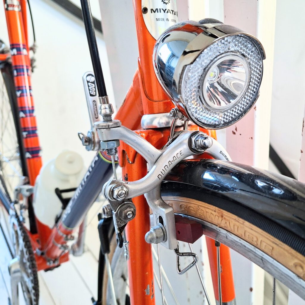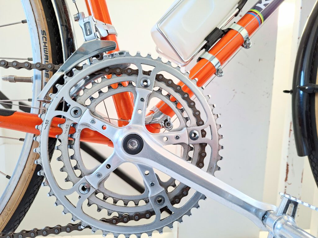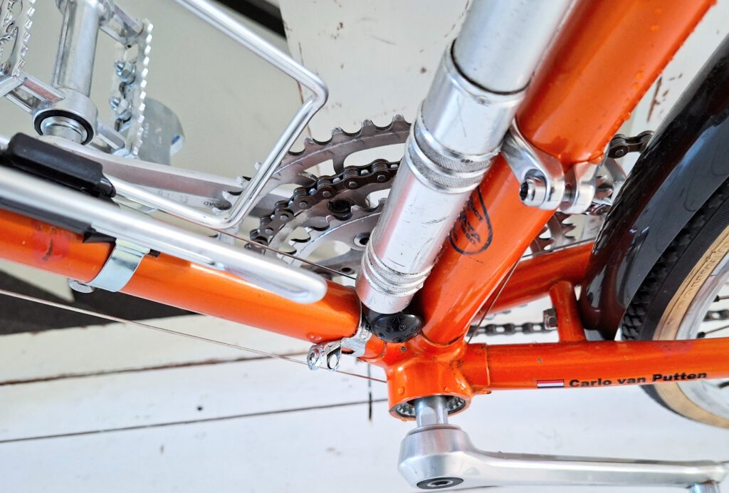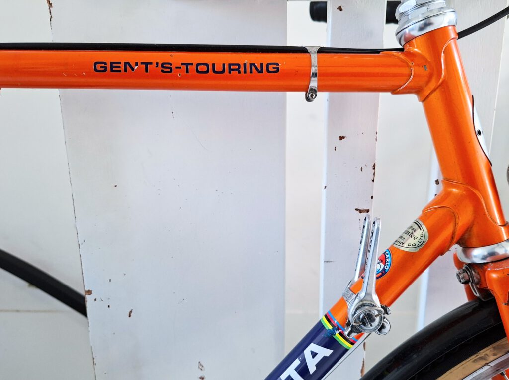 Staat: De fiets verkeert in prachtige staat. Het betreft een standaard Koga Miyata uit het eerste productiejaar. Uiteraard zijn er gebruikssporen aanwezig die passen bij de leeftijd (zie foto’s) tegenwoordig noemen we dat ‘patina’. Desondanks is de fiets volledig gerestaureerd, met oog voor zowel modern comfort als het behoud van zijn klassieke uitstraling. De fiets is voorzien van hoogwaardige Shimano Dura-Ace remhoeven, evenals stijlvolle, vintage spatborden en batterijverlichting — ideaal voor ontspannen citytochten. Daarnaast beschikt hij over een nieuwe trapas met een triple crankset van Ofmega en Deore DX derailleurs, waardoor ook steilere wegen moeiteloos te beklimmen zijn. Alle slijtageonderdelen zijn vakkundig en zorgvuldig vervangen. Zo zijn onder andere de Schwalbe buitenbanden, binnenbanden, rem- en schakelkabels, cassette, tandwielen, stuurlint, ketting en remblokken vernieuwd. De fiets is uitgerust met een zogenoemd city racer-stuur, dat zorgt voor extra controle en comfort op de weg. Desgewenst kan dit uiteraard worden vervangen door een klassiek racestuur.